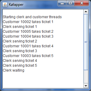 1 import java.awt.EventQueue; 2 import javax.swing.*; 3 4 /* 5 * Klassen oppretter etter tur fem tråder av type NumberThread og 6 * starter dem. Alle trådene tilføyer sine forskjellige tall i det 7 * samme tekstområdet. 8 */ 9 public class Numbers extends JFrame 10 { 11 private int antTråder = 5; 12 13 public Numbers() 14 { 15 super("Trådeksempel"); 16 JTextArea utskrift = new JTextArea(10, 50); 17 getContentPane().add(new JScrollPane(utskrift)); 18 setSize(400, 500); 19 setVisible(true); 20 Thread[] tall = new Thread[antTråder]; 21 for (int i = 0; i < antTråder; i++) 22 { 23 tall[i] = new Thread(new NumberThread(i + 1, utskrift)); 24 tall[i].start(); 25 } 26 } 27 28 public static void main(String args[]) 29 { 30 EventQueue.invokeLater(new Runnable() 31 { 32 33 public void run() 34 { 35 JFrame vindu = new Numbers(); 36 vindu.setDefaultCloseOperation(JFrame.EXIT_ON_CLOSE); 37 } 38 }); 39 } 40 }